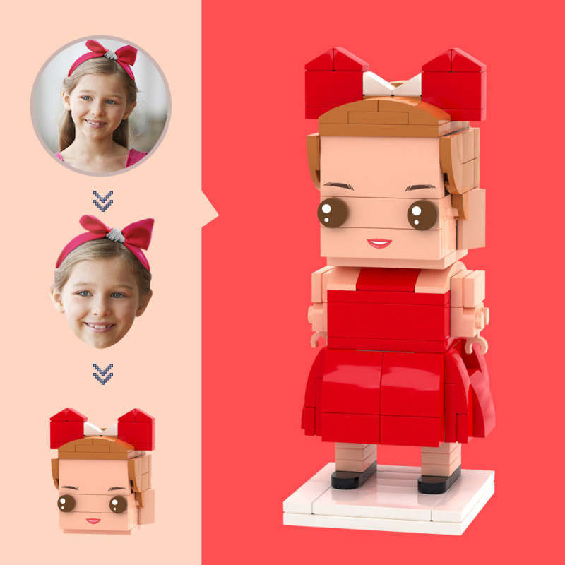 Figure di gonna rossa per bambini con testa personalizzata Figure di piccoli blocchi di particelle Regali personalizzabili in mattoni